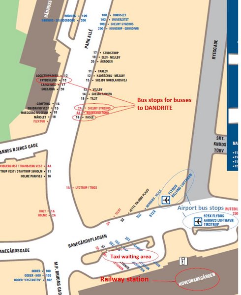 The distance from the main railway station in Aarhus to DANDRITE is around 2.5 km and takes around 20 min by bus, 5 min by taxi, and the walk to DANDRITE will take around 35 min (see suggested route).