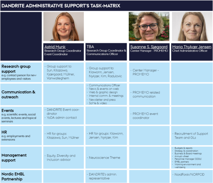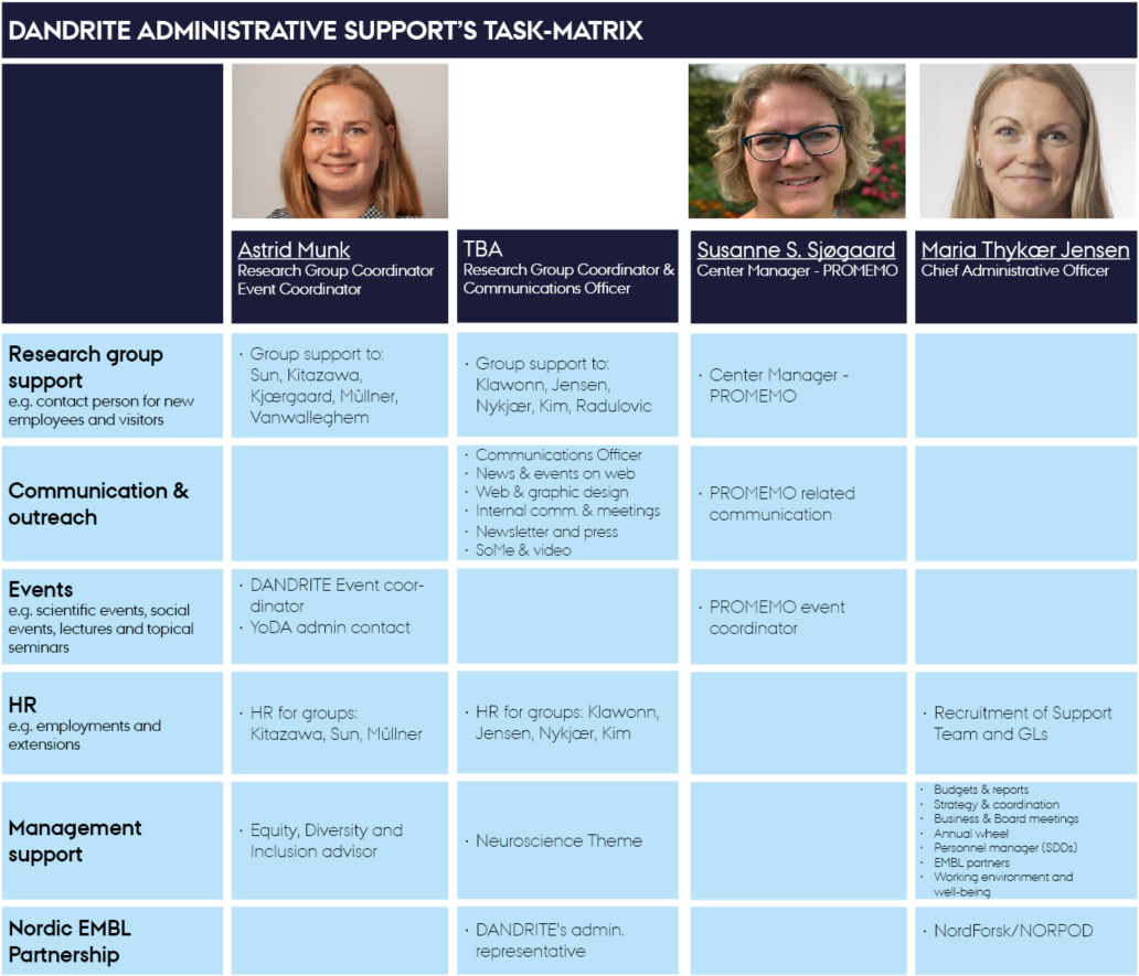 The Support Team aims at ensuring a cohesive, efficient and professional administration and research support for employees and students connected to DANDRITE. The Support Team strives for providing the framework needed for every single DANDRITE researcher to reach their full potential.